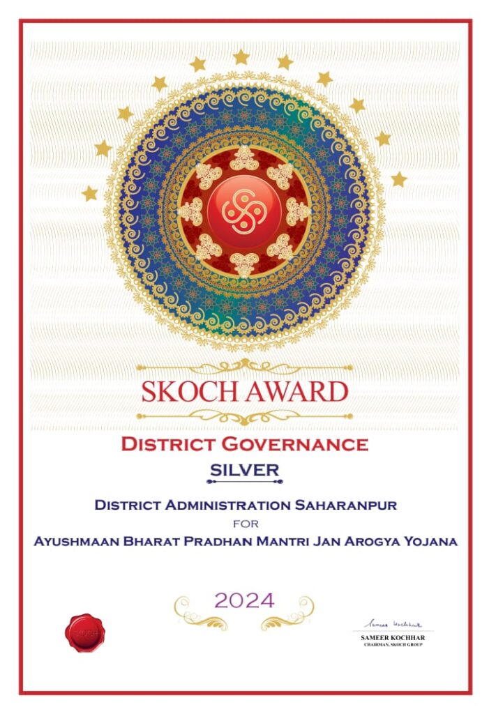 लखनऊ : 2023 में आयुष्मान अभियान को जमीन पर साकार करने में सहारनपुर जिला अव्वल रहा था. इस उपलब्धि के लिए जिलाधिकारी रहे दिनेश चंद्र को “स्कॉच अवार्ड 2024” के लिए आमंत्रित किया गया. फ़िलहाल “स्कॉच अवार्ड 2024” का सिल्वर पत्र मिल चुका है.