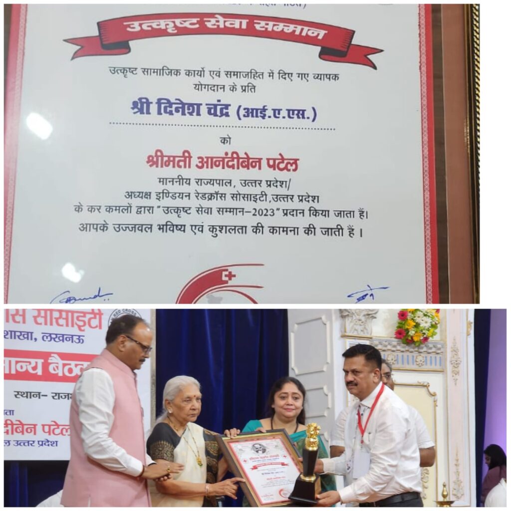 इंडियन रेडक्रास सोसायटी उत्तर प्रदेश द्वारा वरिष्ठ आईएएस अधिकारी डा दिनेश चन्द्र को “उत्कृष्ट सेवा सम्मान” से राज्यपाल आनंदी बेन ने किया सम्मानित